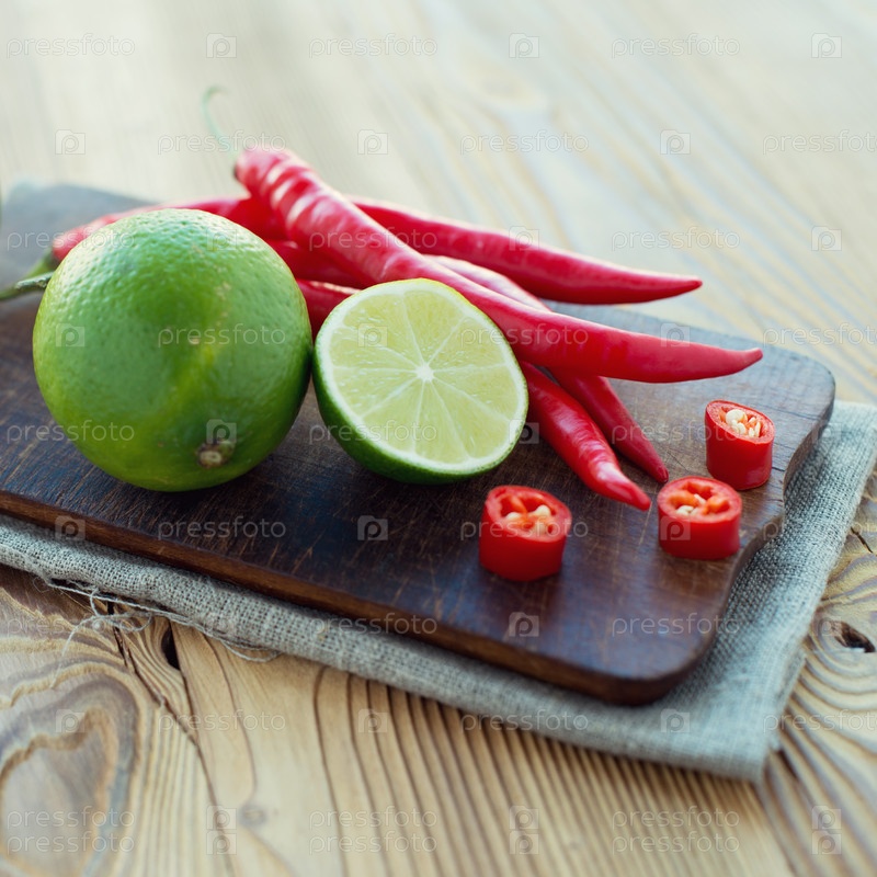 Спелые лаймы и красный перец чили на разделочной доске