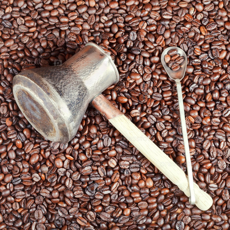 Жареный кофе в зернах и медная турка