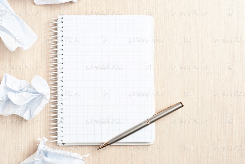 Шариковая ручка на тетради и скомканные листы бумаги рядом
