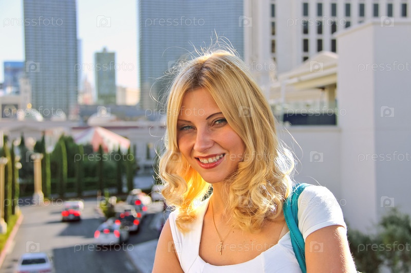 Улыбающаяся блондинка в городе летом