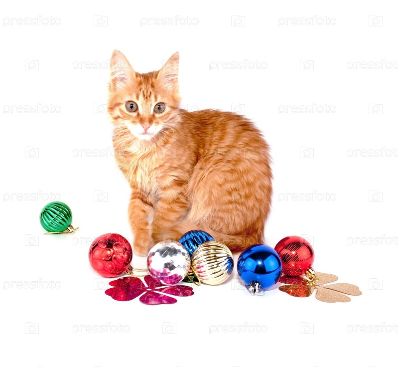 Рыжий кот с елочными шарами