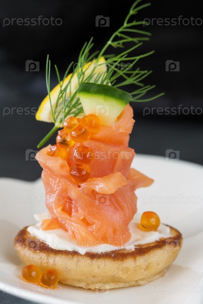 Блин с копченым лососем, икрой и сметаной, украшенный укропом. Крупным планом