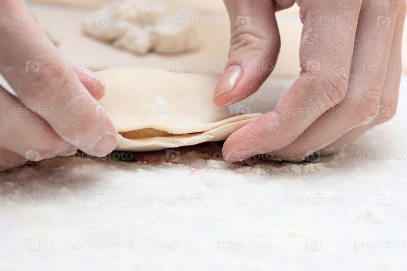Руки повара лепят пирожки на кухне