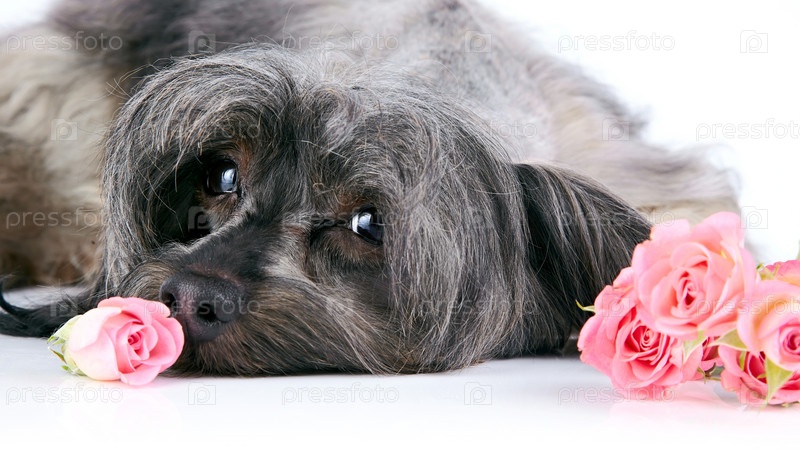 Портрет декоративной собаки с розами