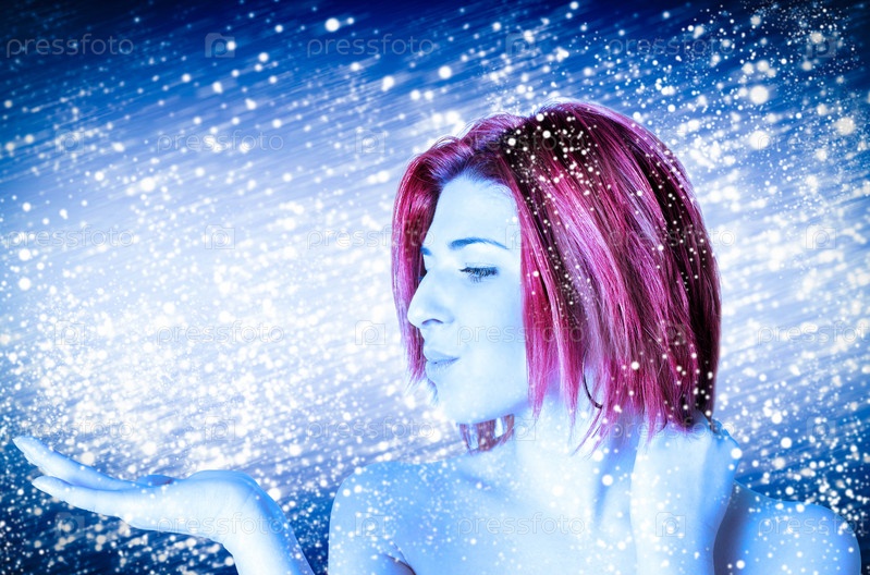 Девушка-зима холодной красоты с фиолетовыми волосами на фоне снежной метели на абстрактном голубом фоне