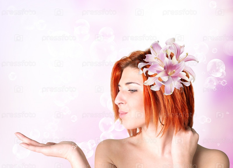 Рыжеволосая девушка с лилии в волосах на абстрактном розовом фоне с мыльными пузырями.Уход за кожей.Спания