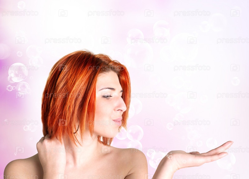 Рыжеволосая девушка на абстрактном розовом фоне с мыльными пузырями.Уход за кожей.Спа