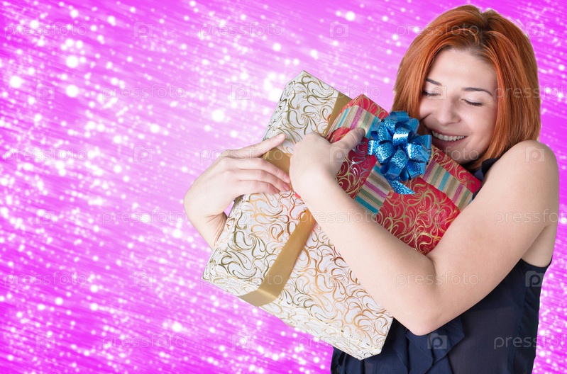 Счастливая улыбающаяся рыжая девушка с праздничными подарками на розовом фоне с белой метелью