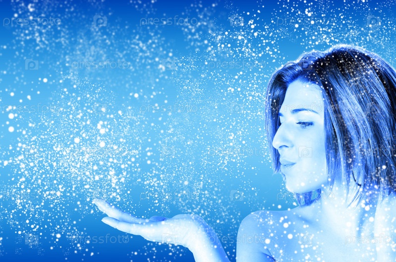 Девушка-зима холодной красоты с фиолетовыми волосами на фоне снежной метели на абстрактном голубом фоне