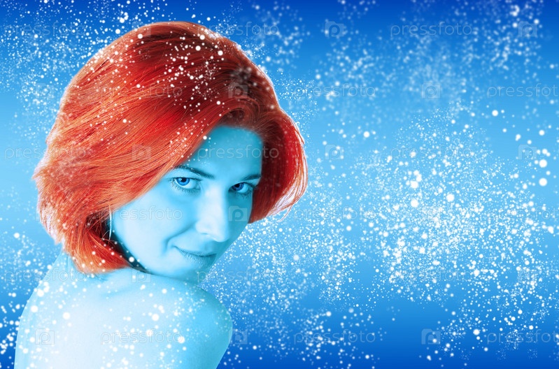 Девушка с рыжими волосами на фоне снежной метели на абстрактном голубом фоне