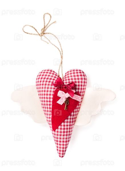 Текстильное сердце с ключом на белом фоне. Ручная работа