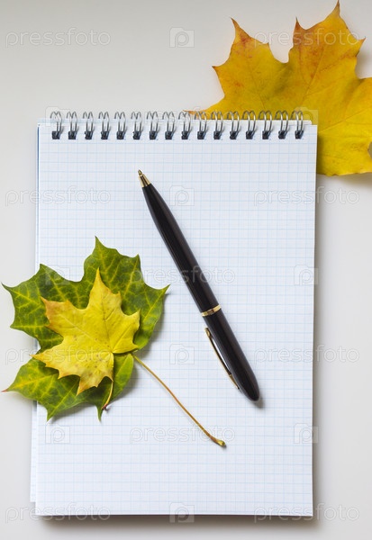 Осенние кленовые листья, блокнот и ручка
