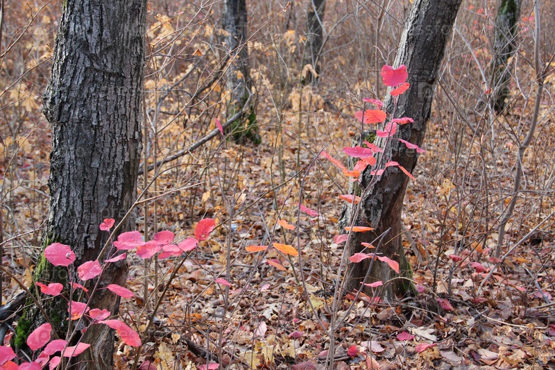 Красные лепестки кустарника на фоне стволов деревьев
