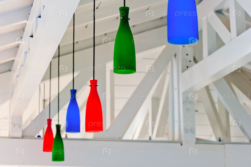 Декоративные цветные фонари под деревянным потолком