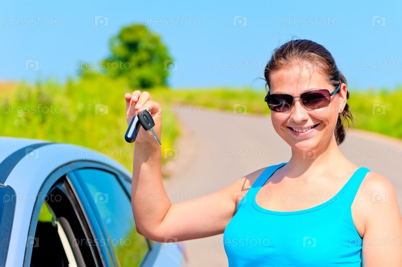 Молодая женщина с гордостью показывает ключи для своего нового автомобиля