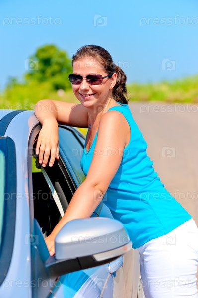 Счастливая девушка стоит возле своего автомобиля на дороге