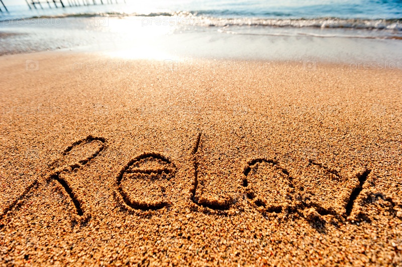 Надпись "отдых" на песке у моря
