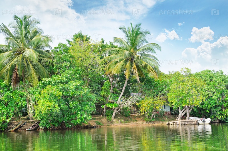Тропическая река с пальмами на берегу