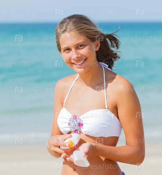 Красивая молодая девушка применяет солнцезащитный крем
