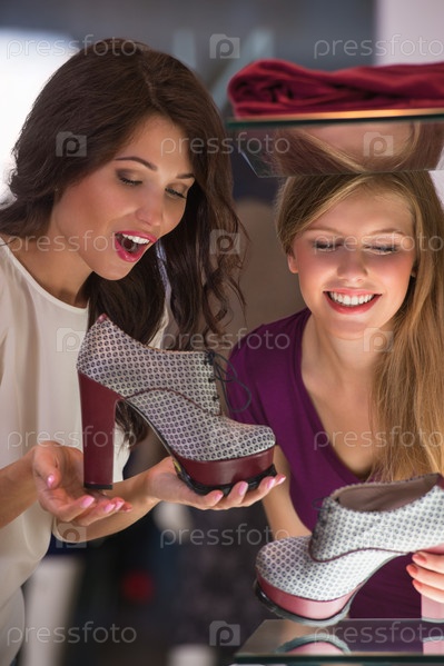 Две красивые девушки выбирают обувь в магазине