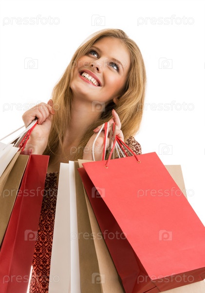 Молодая женщина с покупками на белом фоне