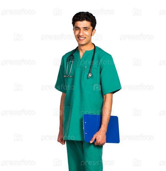 Портрет доктора арабской национальности с планшетом на белом фоне