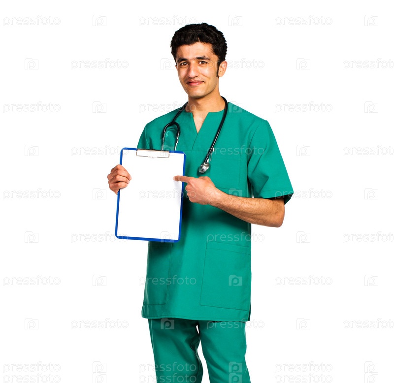 Портрет доктора арабской национальности с планшетом на белом фоне