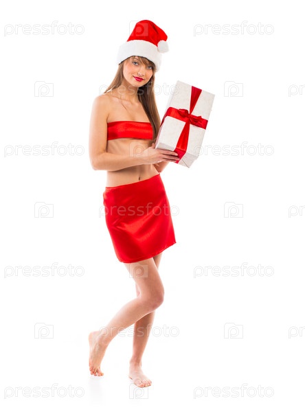 Красивая девушка Санта-Клаус с подарком, изолированная на белом