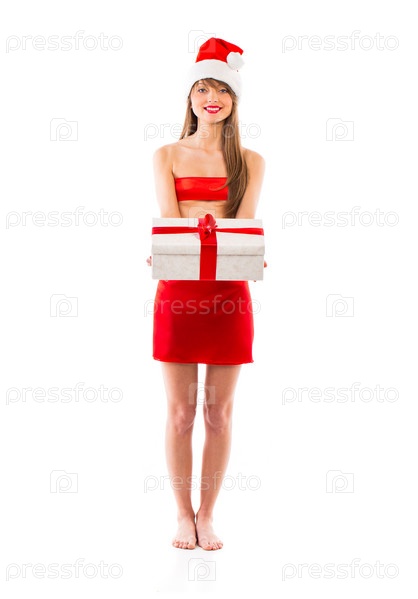 Красивая девушка Санта-Клаус с подарком, изолированная на белом