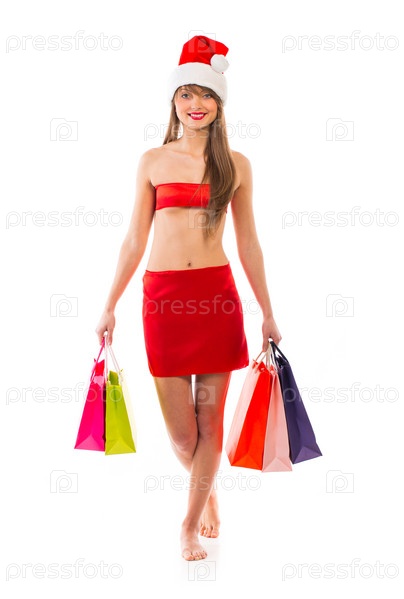 Красивая девушка Санта-Клаус с покупками на белом фоне