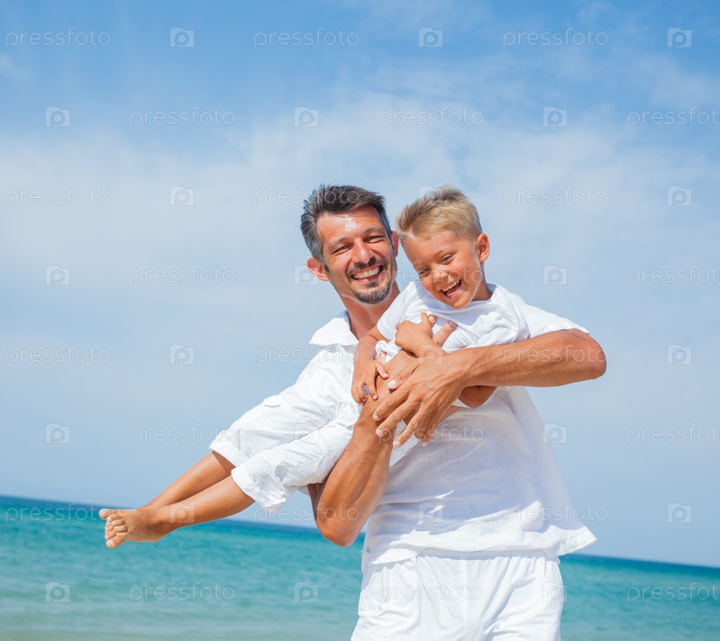 Отец и сын веселятся на пляже