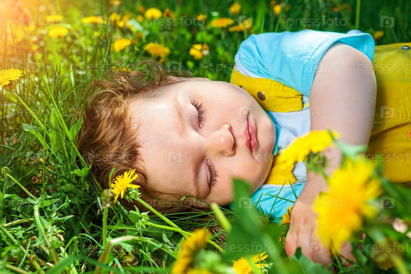Спящий на траве мальчик