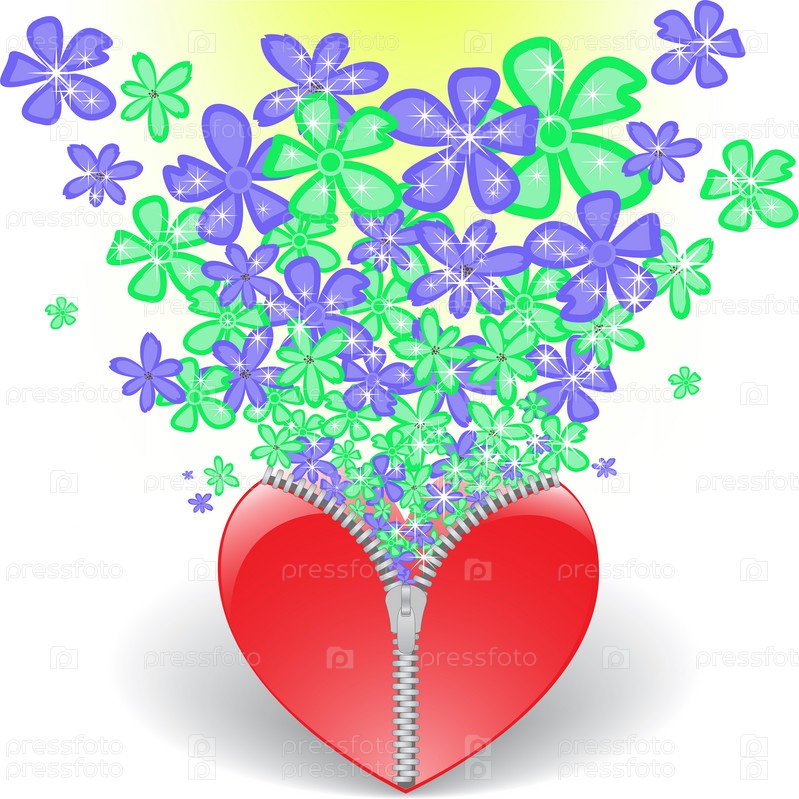 Сердце с застежкой и вылетающими изнутри разноцветными цветами