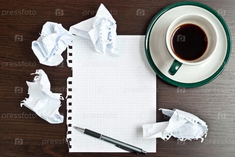 Чашка кофе и листы бумаги на темном столе
