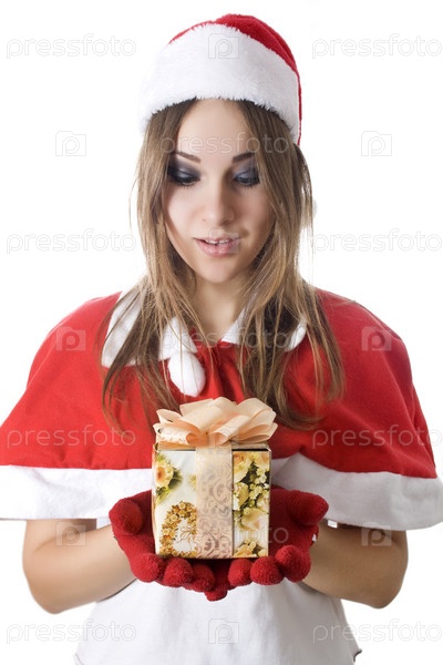 Красивая молодая женщина в шапке Санта-Клауса с подарком