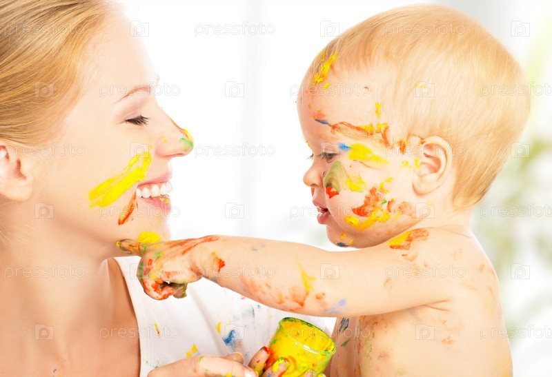 Счастливый грязный ребенок рисует красками на лице матери