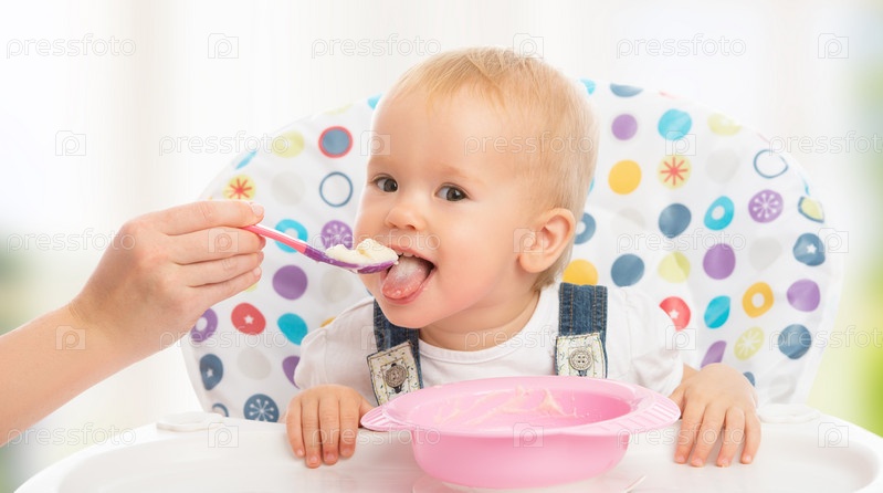 Мать кормит забавного ребенка с ложки