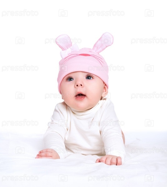 Девочка в розовой шапке с ушами кролика, изолированная на белом