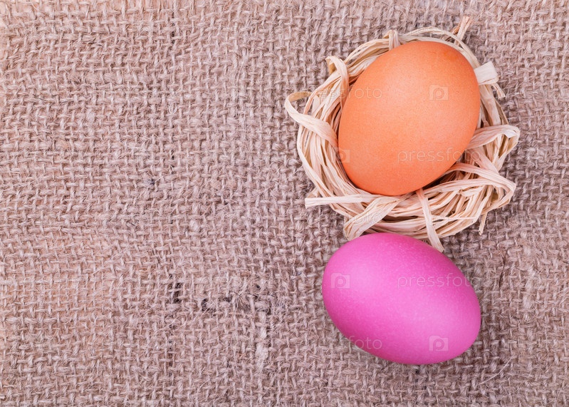Пасхальные яйца на фоне мешковины, вид сверху