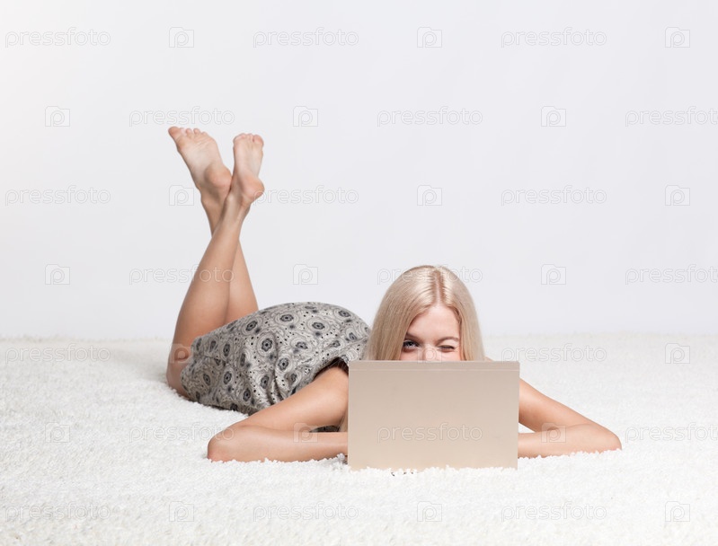 Подмигивающая женщина с ноутбуком