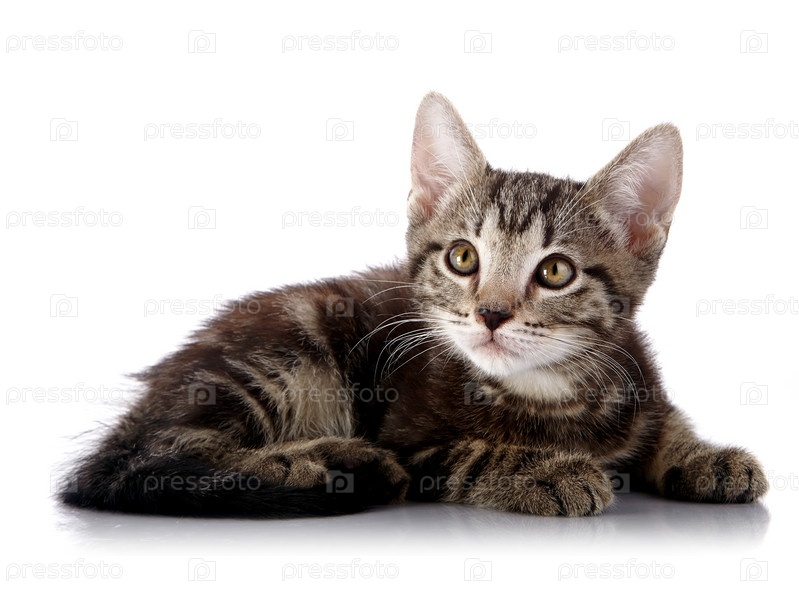 Полосатый беспородный котенок на белом фоне