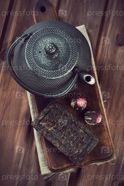Чайник тэцубин и различный сухой чай, деревянный фон