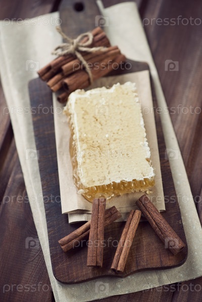 Палочки корицы и медовые соты на разделочной доске