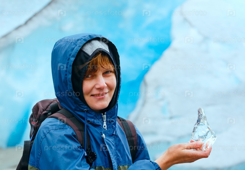 Женщина с куском льда возле ледника Нигардсбреен, Норвегия