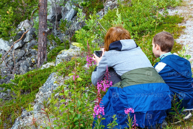 Мать с сыном фотографируют цветы