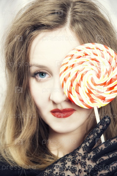 Портрет молодой женщины, кусающей сахарные конфеты