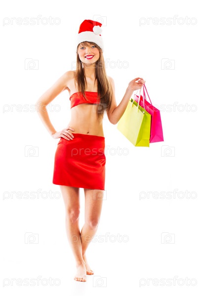 Девушка в колпаке Санта-Клауса с пакетами на белом фоне