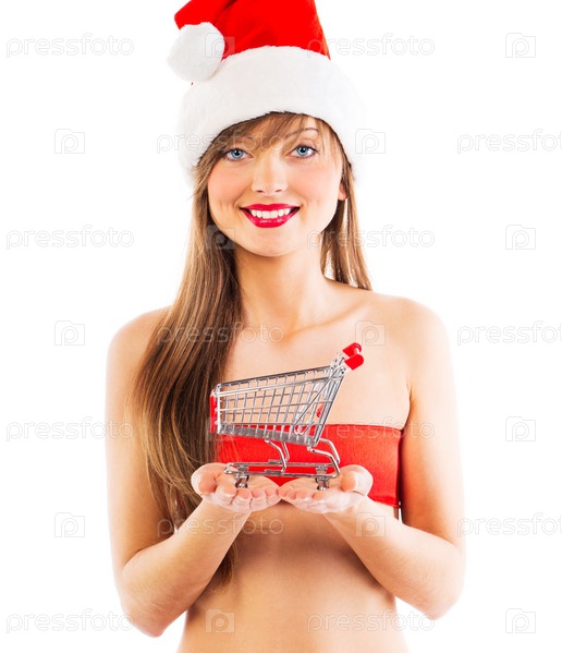 Красивая девушка Санта-Клаус с небольшой тележкой на белом