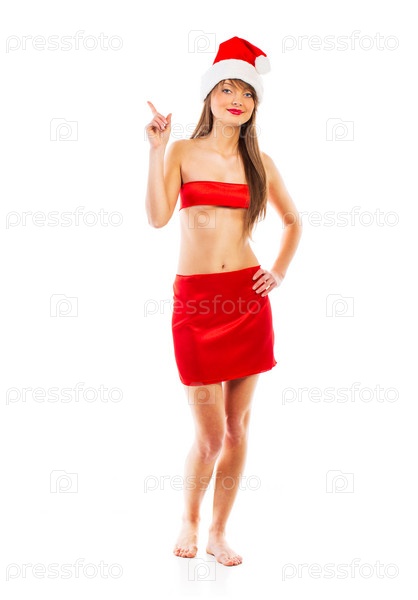 Красивая девушка указывает пальцем, изолированная на белом