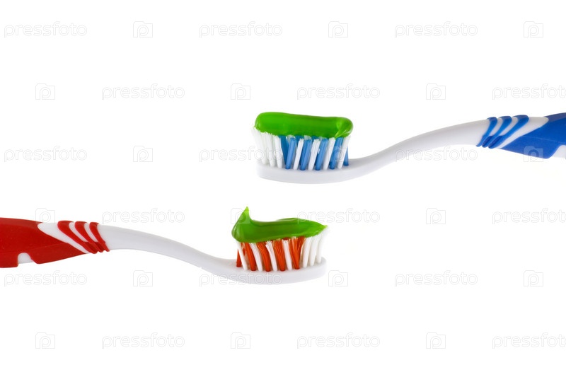Две зубные щетки с пастой на белом фоне